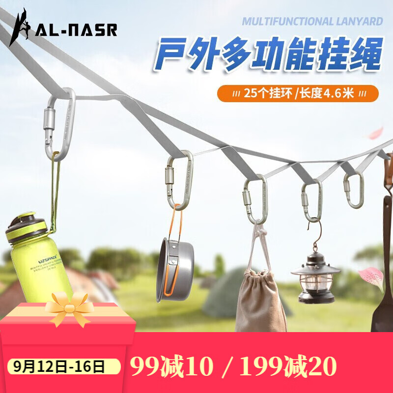 AL-NASR/阿尔纳斯 多功能帐篷挂物吊物绳扁带锁扣头盔挂绳5米尼龙带20mm加宽加强型 4.6米浅灰色