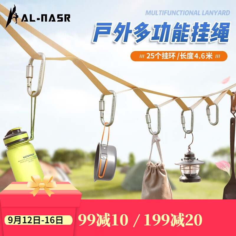 AL-NASR/阿尔纳斯 多功能帐篷挂物吊物绳扁带锁扣头盔挂绳5米尼龙带20mm加宽加强型 4.6米香槟色