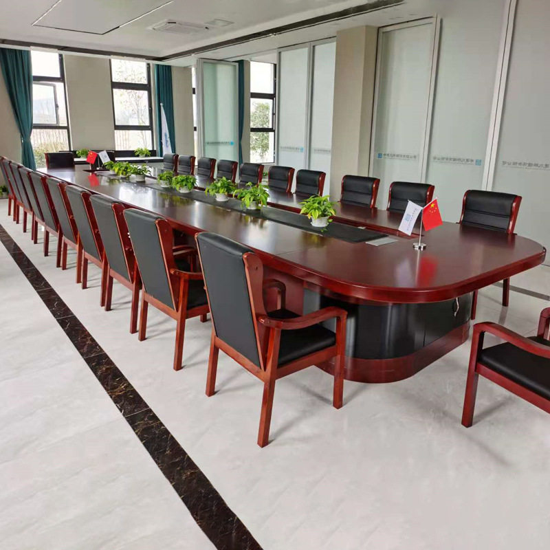 洛来宝大型会议桌多媒体贴木皮会议台桌油漆椭圆形洽谈办公会议桌4.5米含16把带扶手椅子