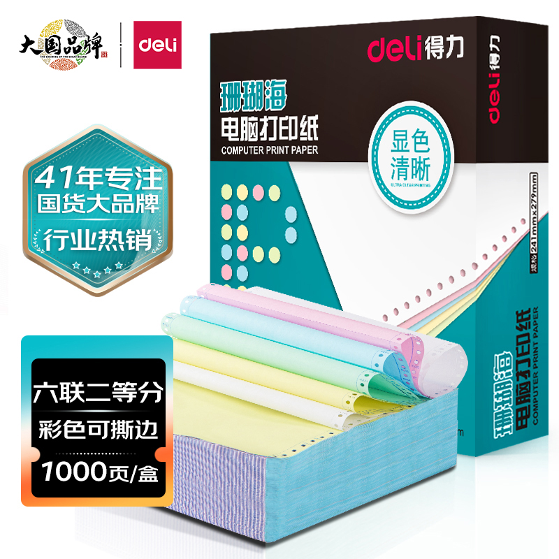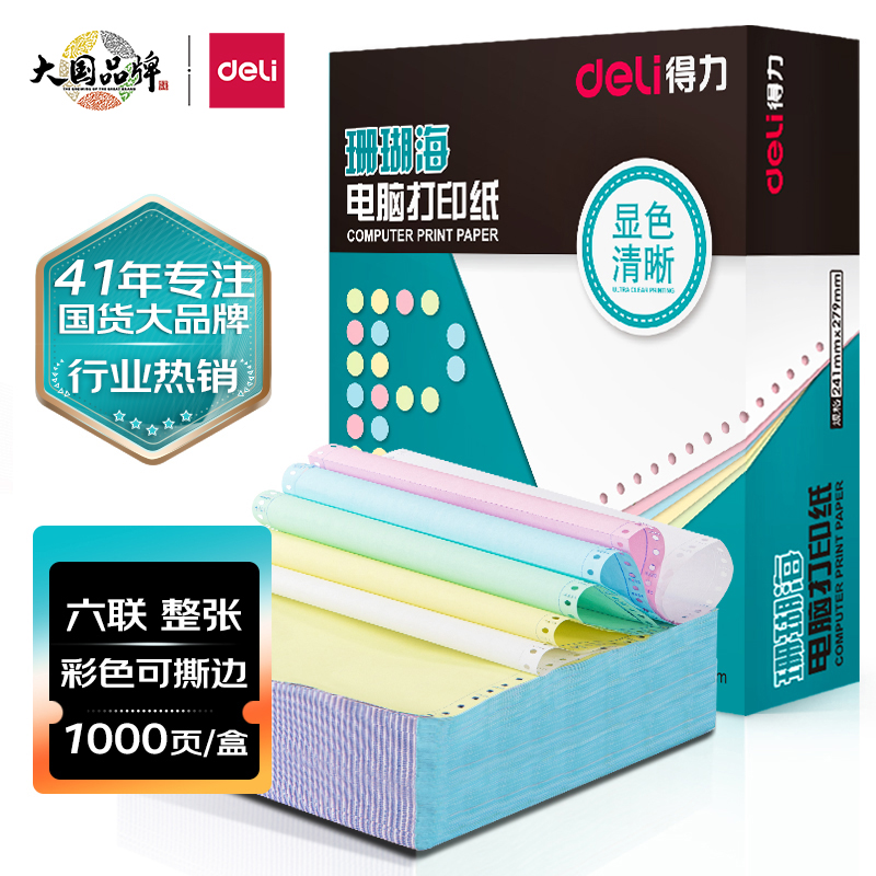 得力(deli)珊瑚海打印纸 六联整张针式打印纸 可撕边电脑打印纸 彩色(白红蓝绿黄白)1000页241-6CS