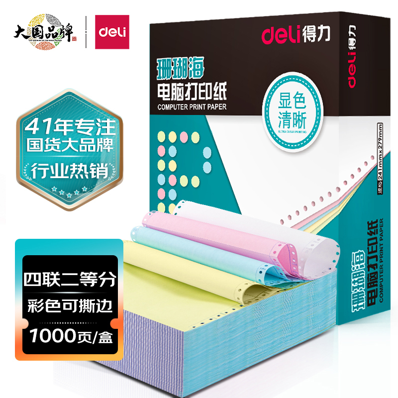 得力(deli)珊瑚海打印纸 四联三等分针式打印纸 可撕边电脑打印纸 彩色(白红蓝黄)1000页/箱241-4-1/3CS