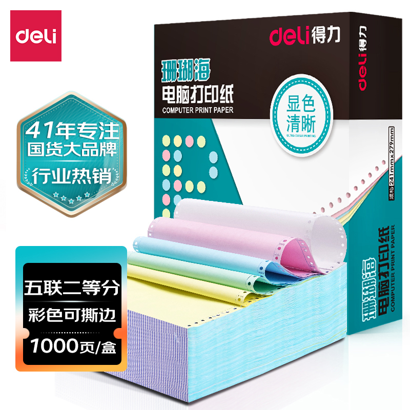 得力(deli)珊瑚海打印纸 五联二等分针式打印纸 可撕边电脑打印纸 彩色(白红蓝绿黄)1000页/箱241-5-1/2CS