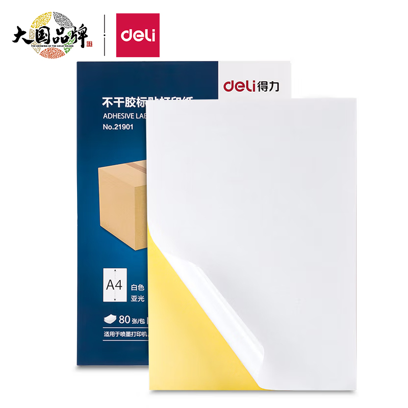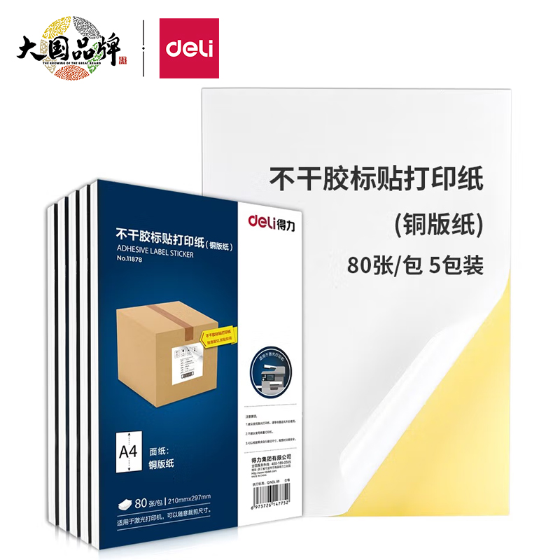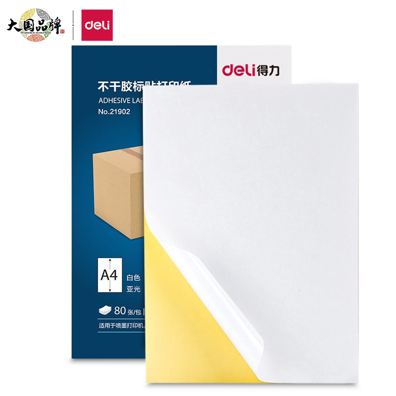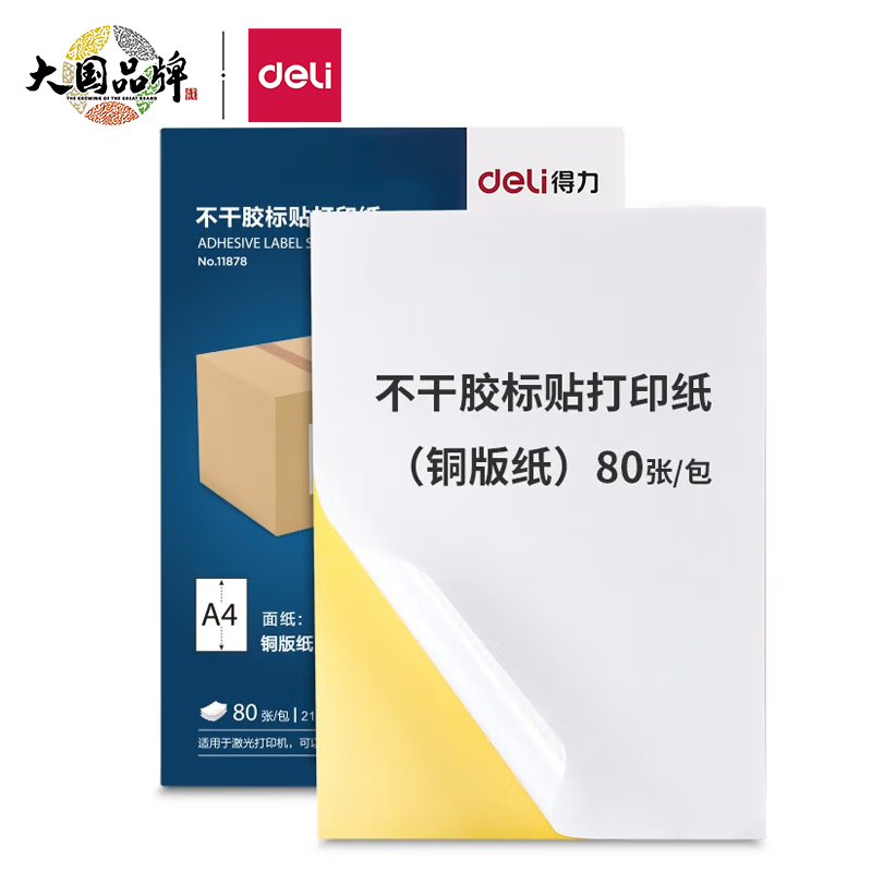 得力(deli)A4不干胶标贴打印纸 带背胶可粘贴标签纸 光面铜版纸 80张 11878
