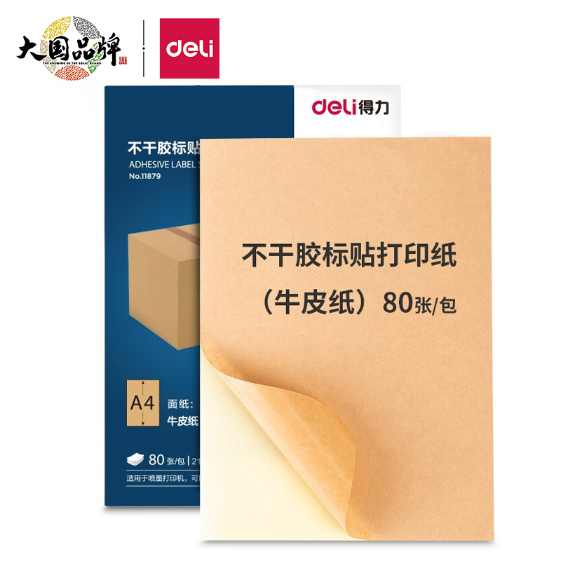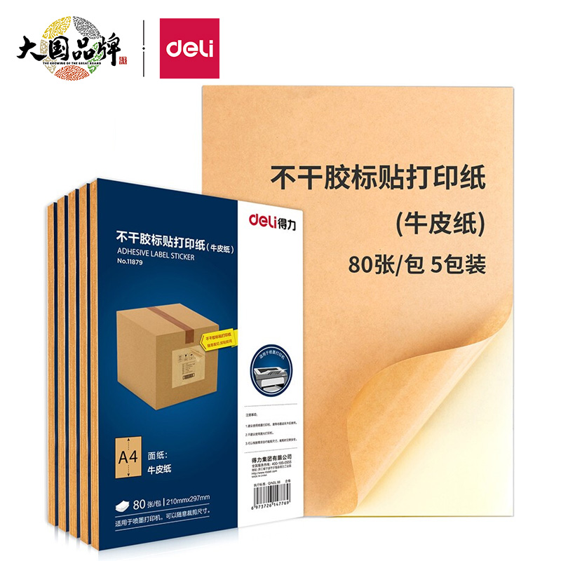 得力(deli)A4不干胶标贴打印纸 带背胶可粘贴牛皮纸标签纸 80张 11879