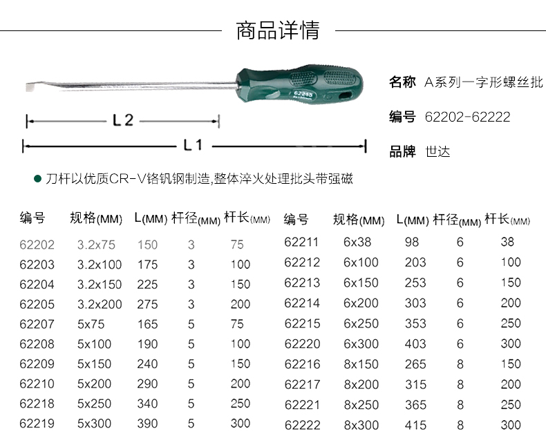 SATA/世达 A系列一字形螺丝批 62208 5×100mm 1把