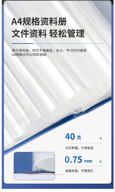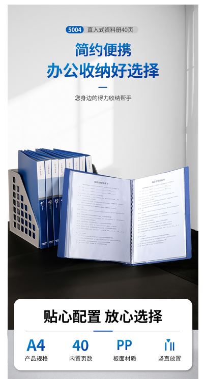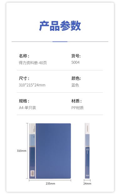 艾逊订货号:H1001736 原始型号:得力(deli)A4/40页资料册 文件收纳册 活页插袋文件夹 办公用品5004 品牌:deli/得力 品牌所属地:中国