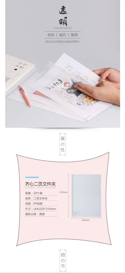 艾逊订货号:H1001738 原始型号:齐心(Comix) 20个装 加厚A4透明二页文件套 L型文件夹 单片夹 EA31 品牌:齐心 品牌所属地:中国
