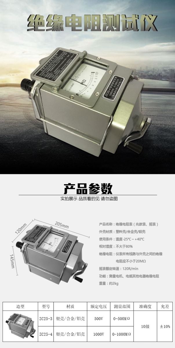 ZC25系列绝缘兆欧表;绝缘电阻:仪表所有线路与外壳之间的绝缘电阻应不小于20MW。ZC25系列试验电压有效值是1000V;