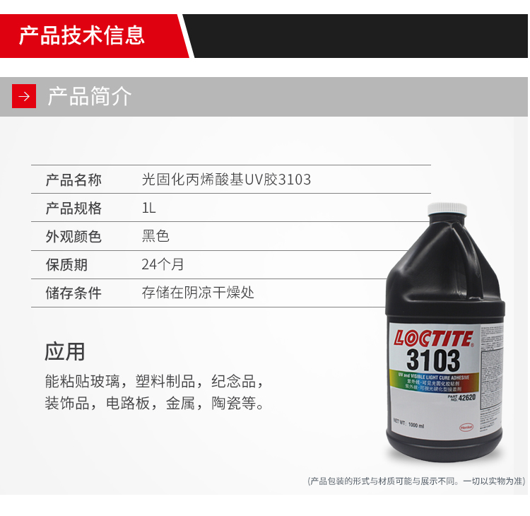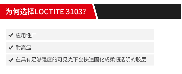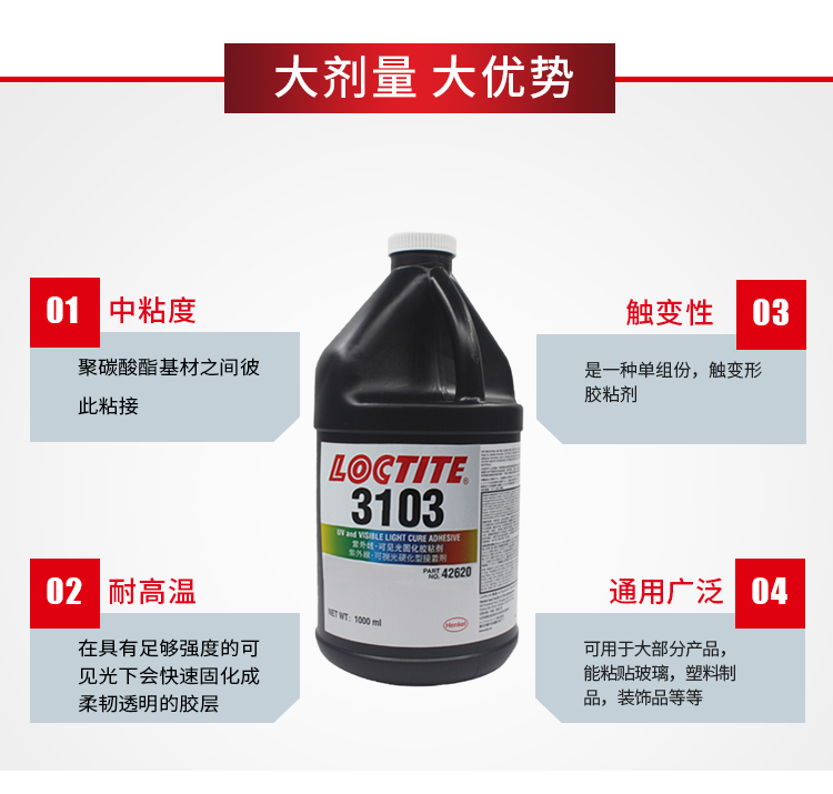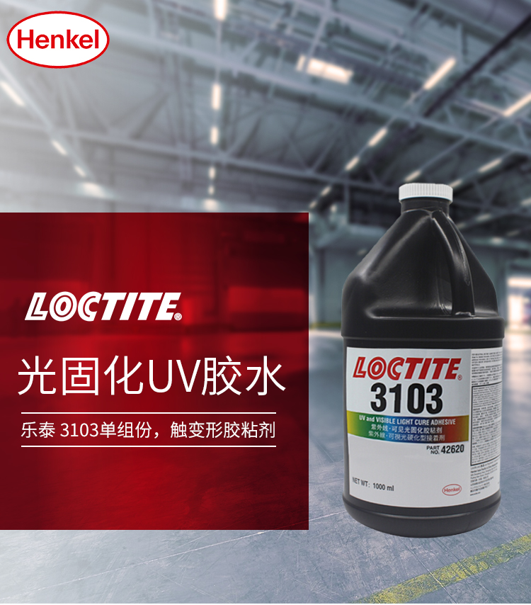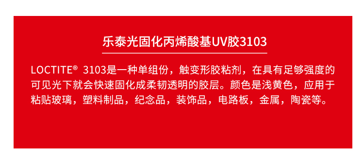 艾逊订货号:H1002108 原始型号:LOCTITE/乐泰 乐泰胶紫外线可见光固化胶粘剂LOCTITE3103 1L 1瓶 品牌:Loctite/乐泰 品牌所属地:中国