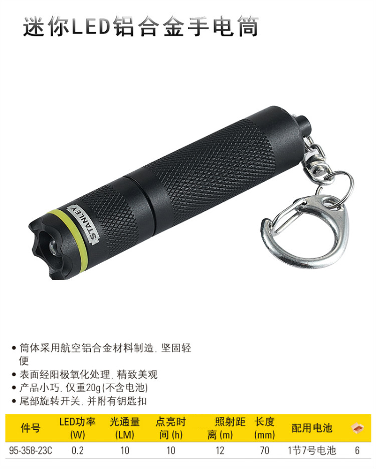 艾逊订货号:E1001900 原始型号:STANLEY/史丹利 LED铝合金手电筒 1个 品牌:STANLEY/史丹利 品牌所属地:中国大陆
