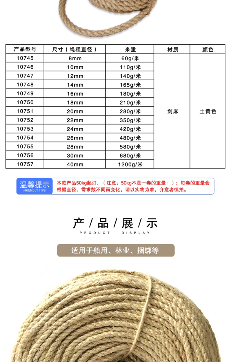艾逊订货号:A1042679 原始型号:安赛瑞 白棕绳麻绳 直径ф10mm 1KG 最小起订量50kg 品牌:SAFEWARE/安赛瑞 品牌所属地:中国