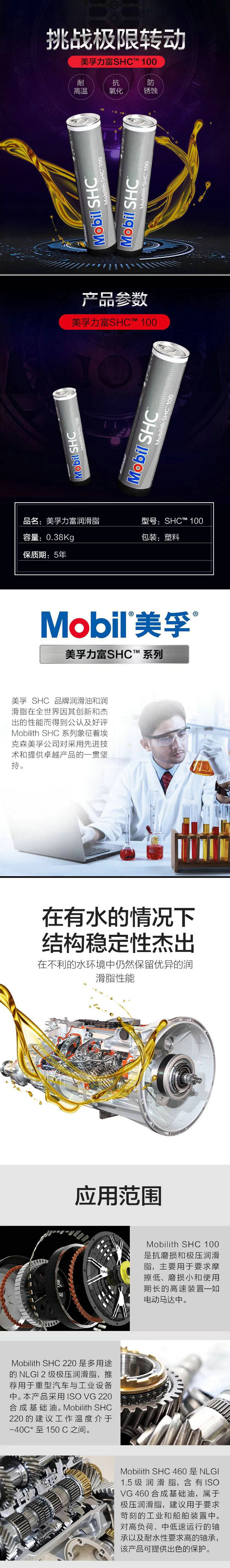 艾逊订货号:H1008764 原始型号:美孚 Mobilith SHC 100,380g 品牌:Mobil/美孚 品牌所属地:美国