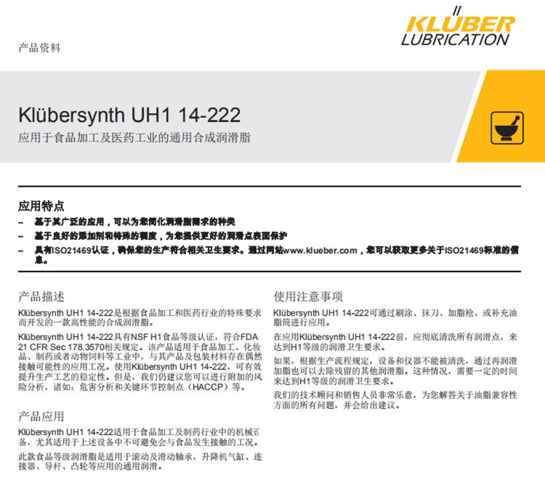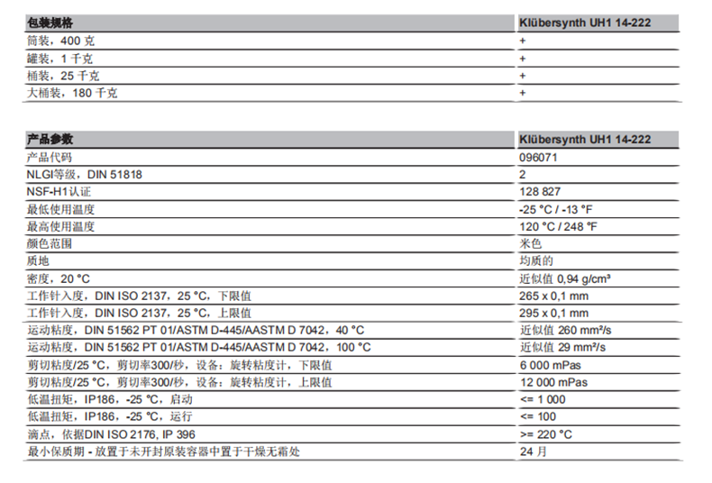 艾逊订货号:H1008925 原始型号:克鲁勃 克鲁勃 食品级润滑脂,UH1 14-222,25KG/桶 品牌:KLUBER/克鲁勃 品牌所属地:中国