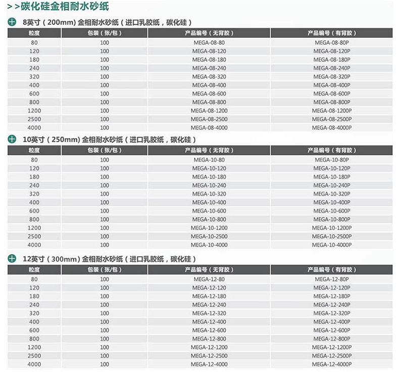中旺量仪碳化硅金相耐水砂纸,无背胶,8寸1200目,100张/包,GA-08-1200 |