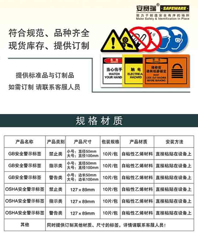 SAFEWARE/安赛瑞的安全警示标签安赛瑞OSHA危险警示标签-当心伤手,127×89mm,32907,10片/包