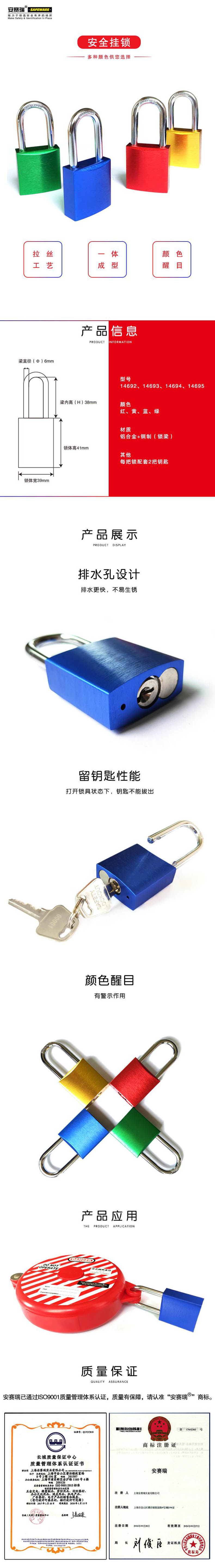 安赛瑞 安全挂锁(蓝),铝合金锁体,钢制锁梁,蓝色,锁梁Ф6mm,高38mm,14694 |