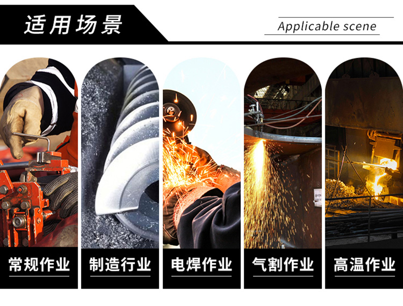 前幅选用耐磨隔热的牛二层皮,后幅配以防火阻燃面料,具有耐久的阻燃性能,数十次洗水后仍符合国际阻燃标准,达到既抗热又清涼的效果