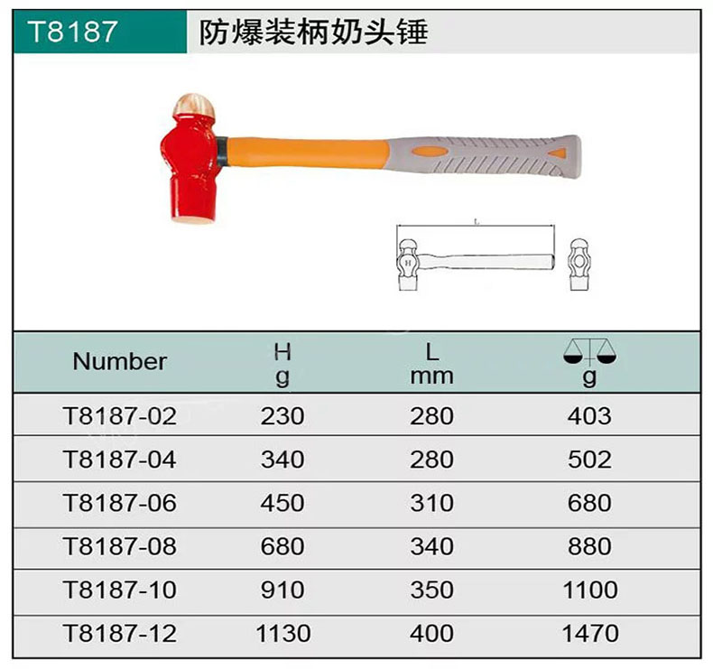 艾逊订货号:D1004450 原始型号:CNFB/桥防 187系列铍青铜防爆装柄奶头锤 T8187-06-BE 0.45kg 1把 品牌:CNFB/桥防 品牌所属地:中国
