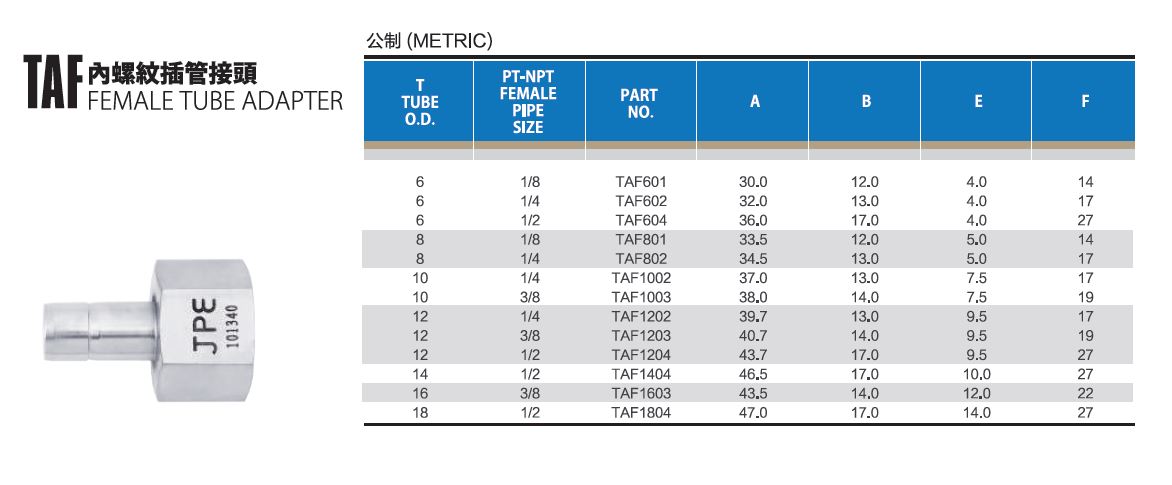 JPE D12-1/2"PT带尾管内螺纹接头,BS6-TAF1204-R |