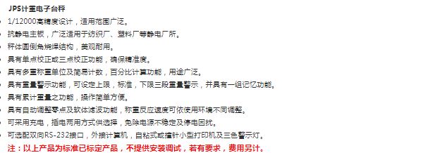 艾逊订货号:A1044084 原始型号:杰特沃 经济型计重电子秤,300kg,最小感量20g 品牌:杰特沃 品牌所属地:中国