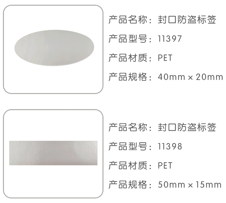 艾逊订货号:A1050624 原始型号:安赛瑞 防伪标签贴,PET,40×20mm,300贴,椭圆形,亚银 品牌:SAFEWARE/安赛瑞 品牌所属地:中国