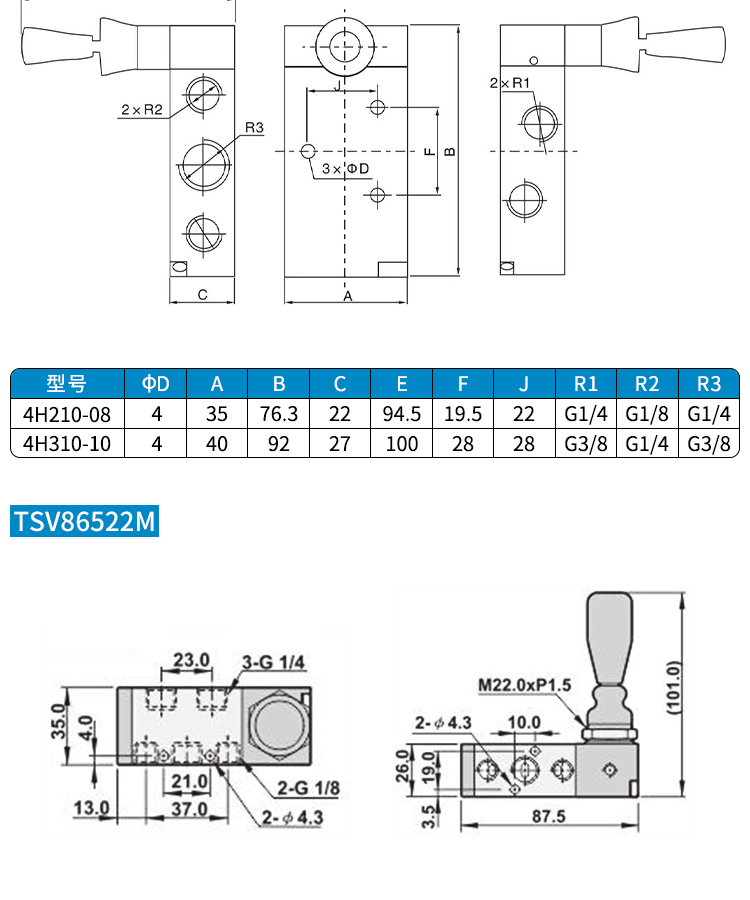 艾逊订货号:M1012858 原始型号:五叶家族气动开关手动阀4h210-08二位五通手扳换向气缸阀门控制4h310-10 TSV 86522M 品牌:五叶家族 品牌所属地:中国