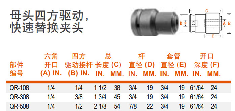 艾逊订货号:D1006741 原始型号:APEX扳手转换头,1/4"四方转1/4"六方快换头,QR-108,QR-108 品牌:APEX/艾沛克斯 品牌所属地: