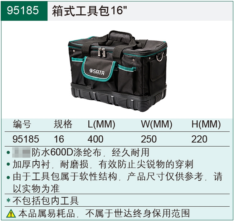 艾逊订货号:D1010458 原始型号:工具包 燃气专用19寸 (空包,布质,可斜挎,拎,打印燃气专用字样) 品牌:SATA/世达 品牌所属地:中国
