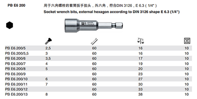 PB 瑞士工具的套筒附件PB瑞士工具E6.3带磁套筒螺母批头,10*60mm,PBE6.200/10M