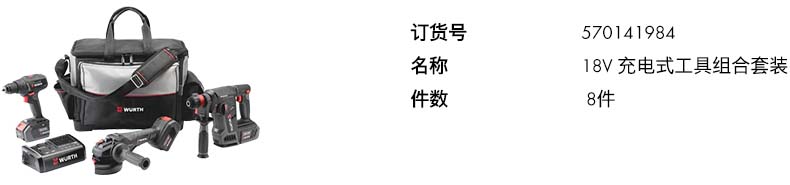 艾逊订货号:D1030863 原始型号:伍尔特 18V充电式工具组合套装,角磨机/电锤/电钻 4.0Ah三电一充,570141984 品牌:WURTH/伍尔特 品牌所属地:
