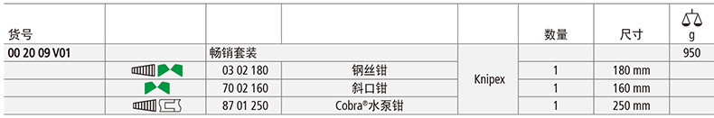 艾逊订货号:D1033097 原始型号:凯尼派克 Knipex 钳子组套,4件套,00 20 01 V01 品牌:KNIPEX/凯尼派克 品牌所属地: