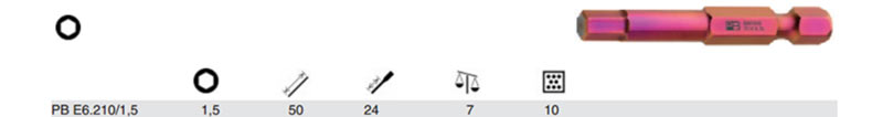 艾逊订货号:D1035871 原始型号:PB 瑞士工具 精密内六方批头,1.5mm 10个/包,PB E6.210/1,5 品牌:PB 瑞士工具 品牌所属地:中国