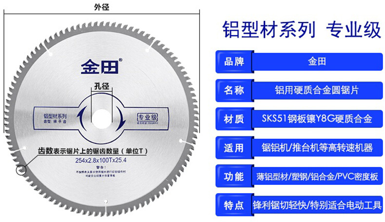 艾逊订货号:D1039320 原始型号:金田合金锯片/铝型材锯片/铝合金专用圆锯片切割片,外径230mm*齿宽2.6mm*100齿 品牌:金田 品牌所属地:中国