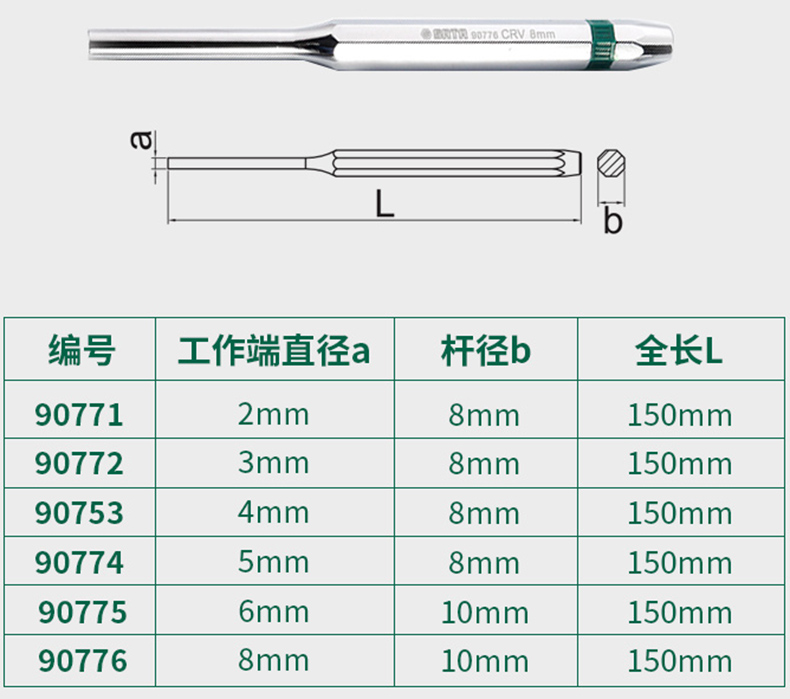 SATA/世达的冲世达销冲,6×150mm,90775,圆柱冲子冲头销子冲针钳工冲圆锥冲子中心冲装订打孔器