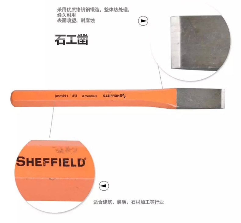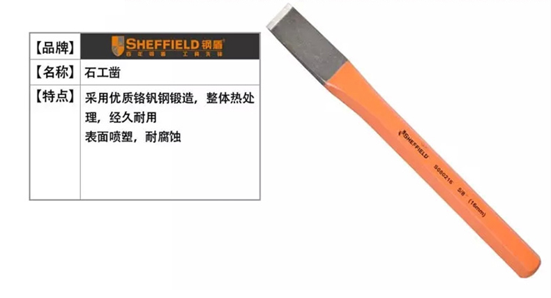 艾逊订货号:D1039523 原始型号:石工凿,25MM,S080203 品牌:SHEFFIELD/钢盾 品牌所属地: