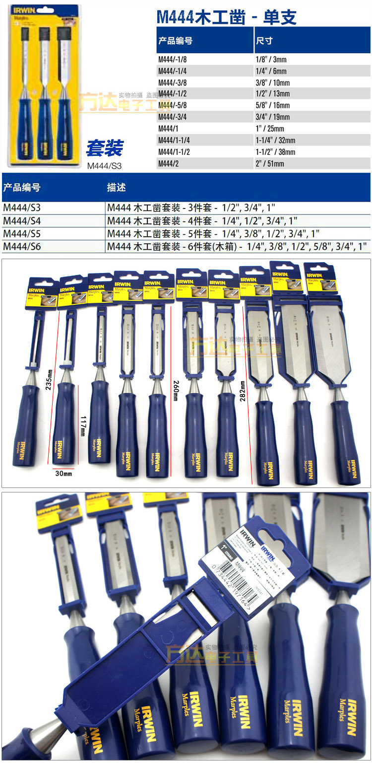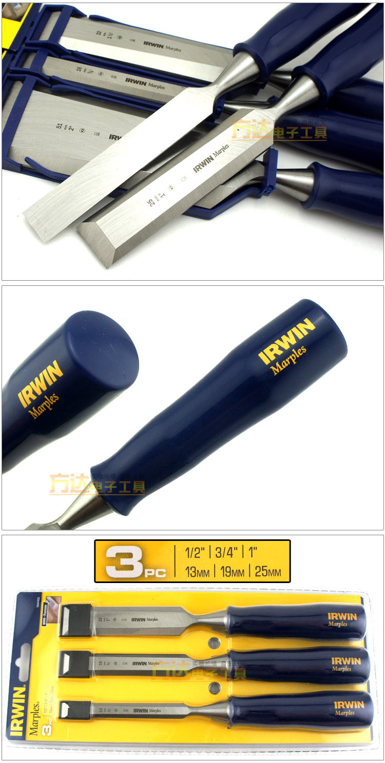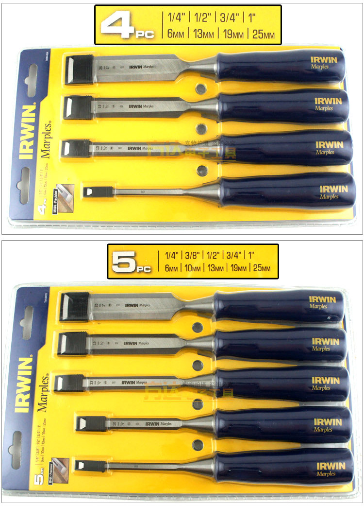 艾逊订货号:D1039560 原始型号:欧文斜口凿,蓝柄木工基本型,4件套(1/4, 1/2", 3/4 & 1") 品牌:IRWIN/欧文 品牌所属地: