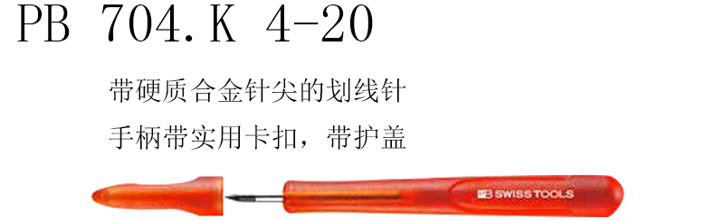 艾逊订货号:D1039566 原始型号:PB SWISS TOOLS 硬质合金划线针,PB 704.K 4-20,划针 划线工具 划线器 品牌:PB 瑞士工具 品牌所属地:
