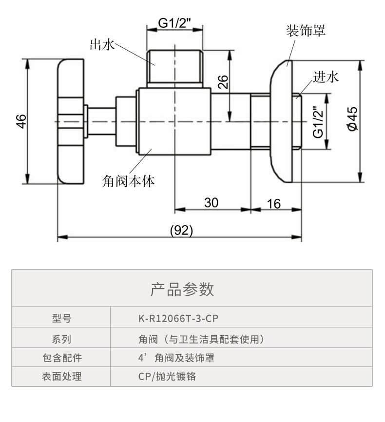 KOHLER/科勒的阀类科勒十字把手角阀(零售包装),K-R12066T-3-CP