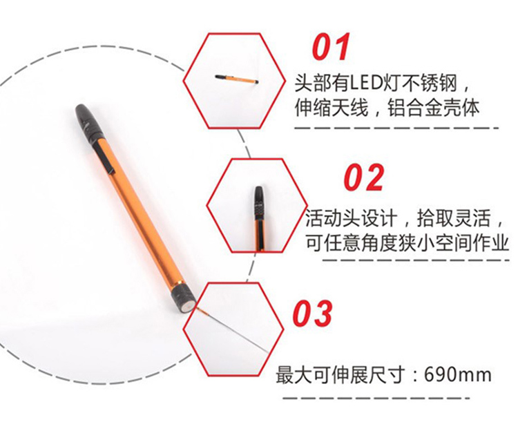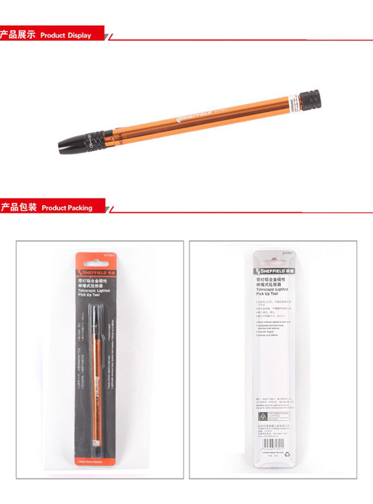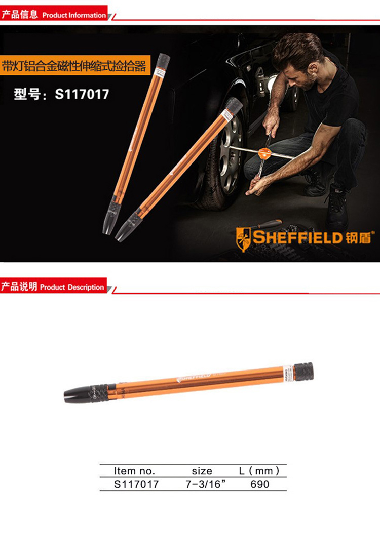艾逊订货号:D1040417 原始型号:磁性伸缩式捡拾器,带灯 铝合金材质,S117017 品牌:SHEFFIELD/钢盾 品牌所属地: