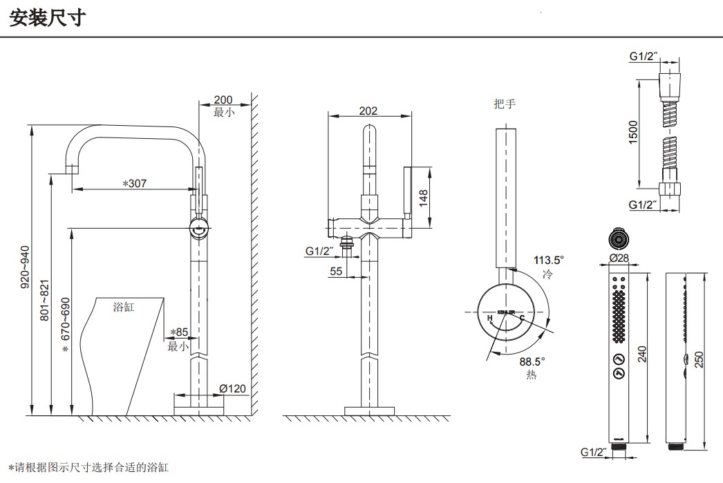 科勒 斯磊挂墙式浴缸花洒龙头,K-45370T-B4DPR-CP |