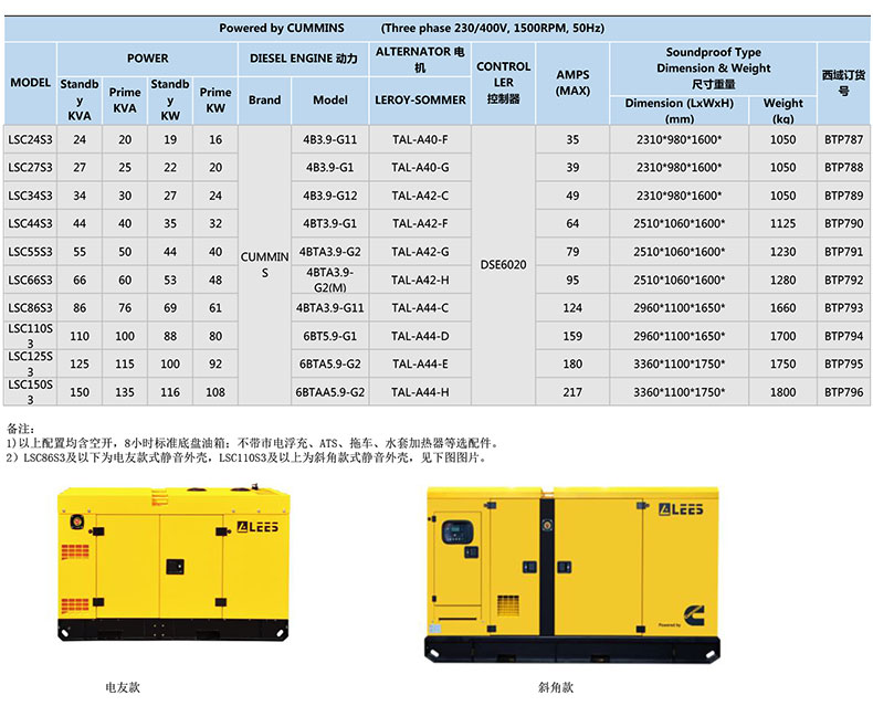 能电LEES 柴油发电机组,康明斯发动机,静音型,主用功率20KW,备用功率21.6KW,LSC27S3 |
