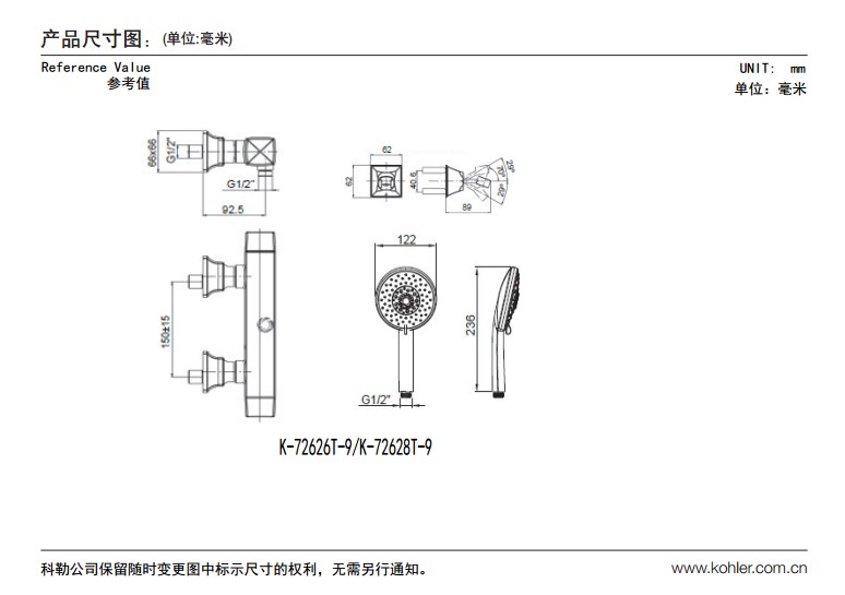 科勒 玛尔戈挂墙式花洒龙头(原K-16297T-9-CP),K-72628T-9-CP |
