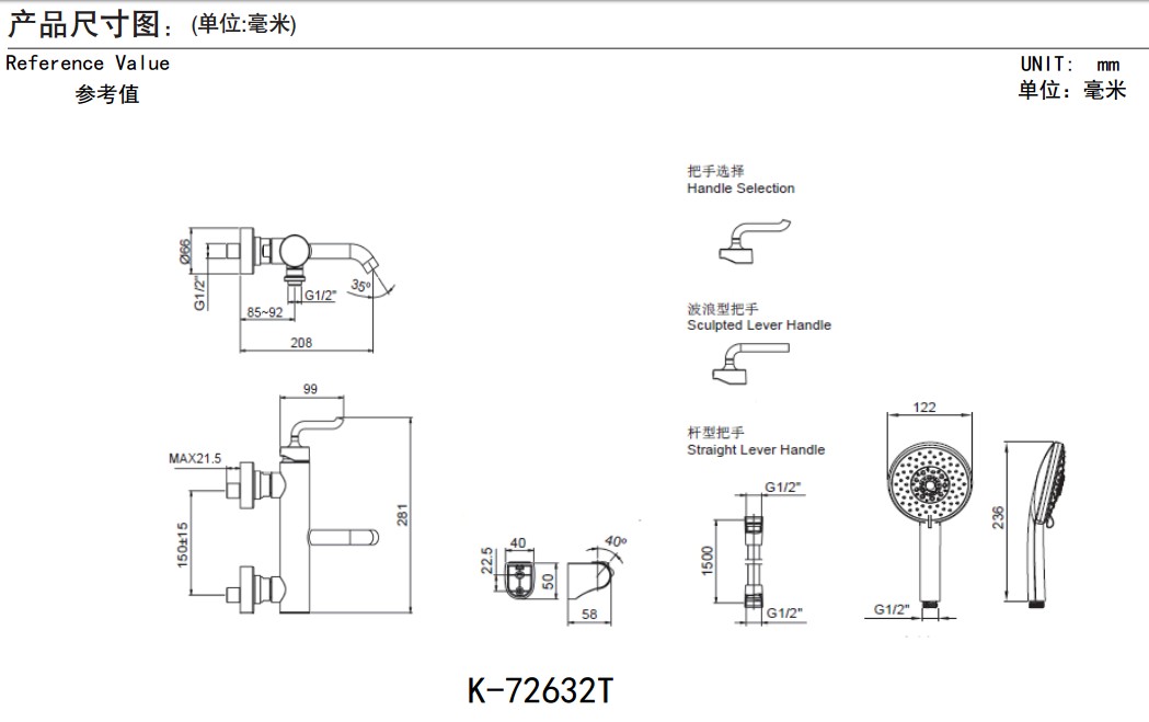 科勒 飘瑞诗挂墙式花洒龙头(原K-14590T-4A-CP),K-72634T-4A-CP |