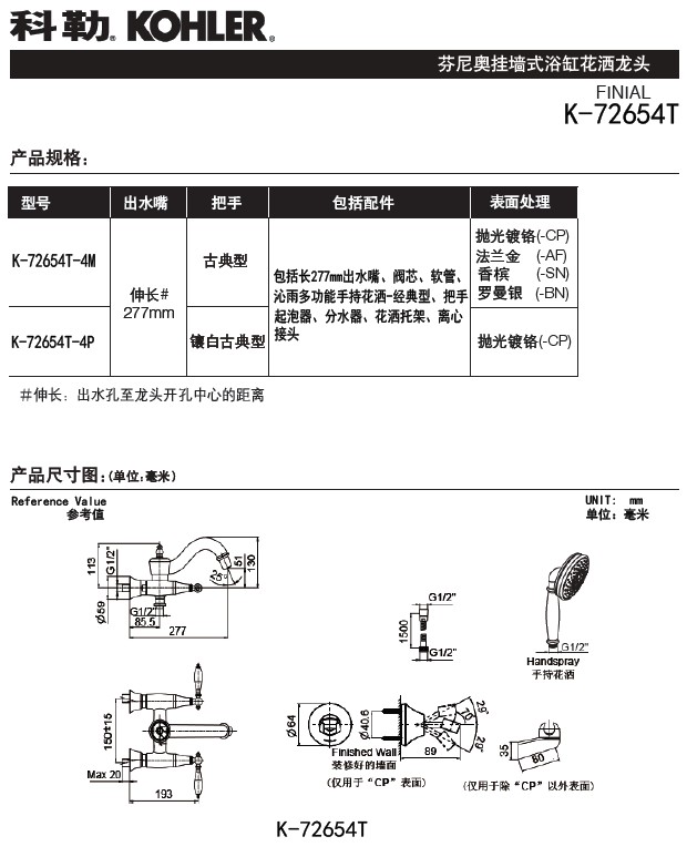 科勒 芬尼奥挂墙式花洒龙头(古典)(原K-8784T-4M-CP),K-72656T-4M-CP |