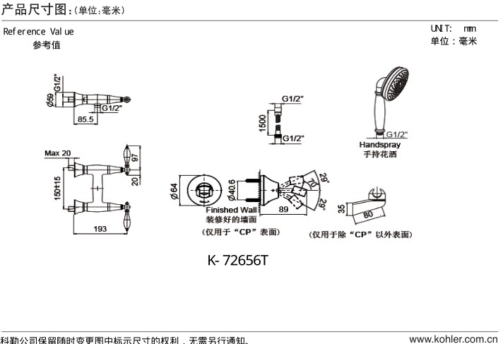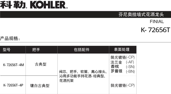 科勒 芬尼奥挂墙式花洒龙头(古典)(原K-8784T-4M-CP),K-72656T-4M-CP |