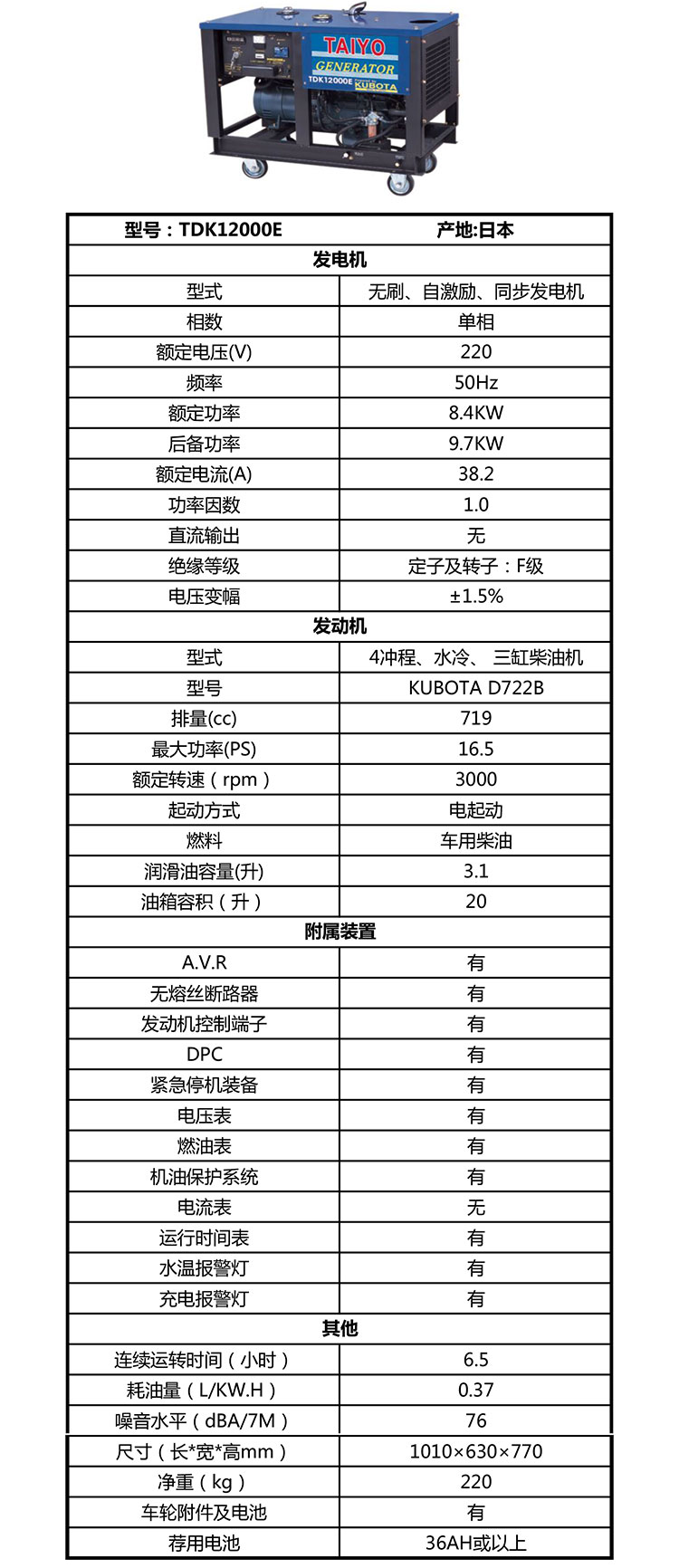 AIXUN艾逊提供TAIYO/大洋的柴油发电机大洋TAIYO柴油发电机,8.4KW,220V,TDK12000E