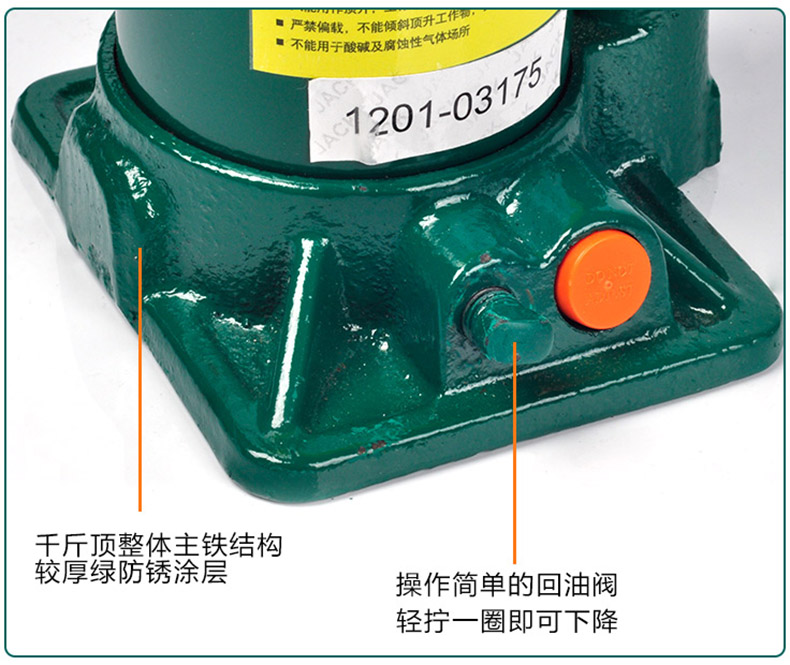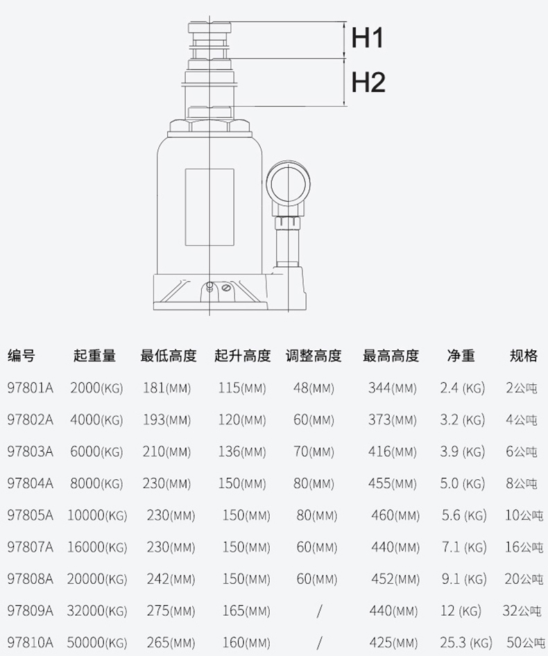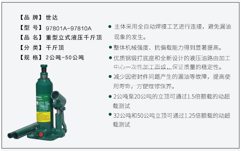 艾逊订货号:D1040926 原始型号:世达立式液压千斤顶,32吨,最低高度275mm 最高高度440mm,97809A 品牌:SATA/世达 品牌所属地: