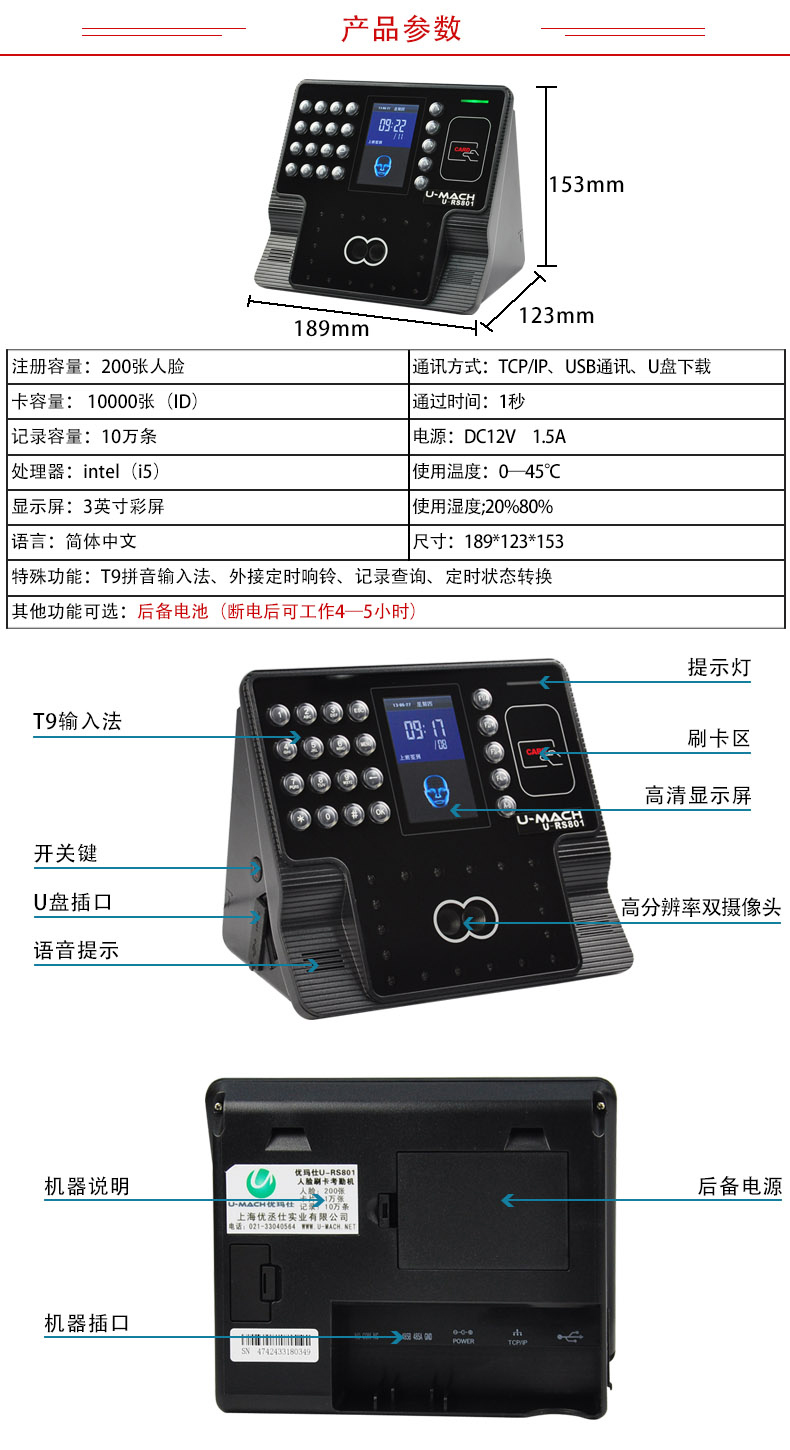 U-MACH/优玛仕的门禁机优玛仕人脸、刷卡考勤机,U-RS801单位:个