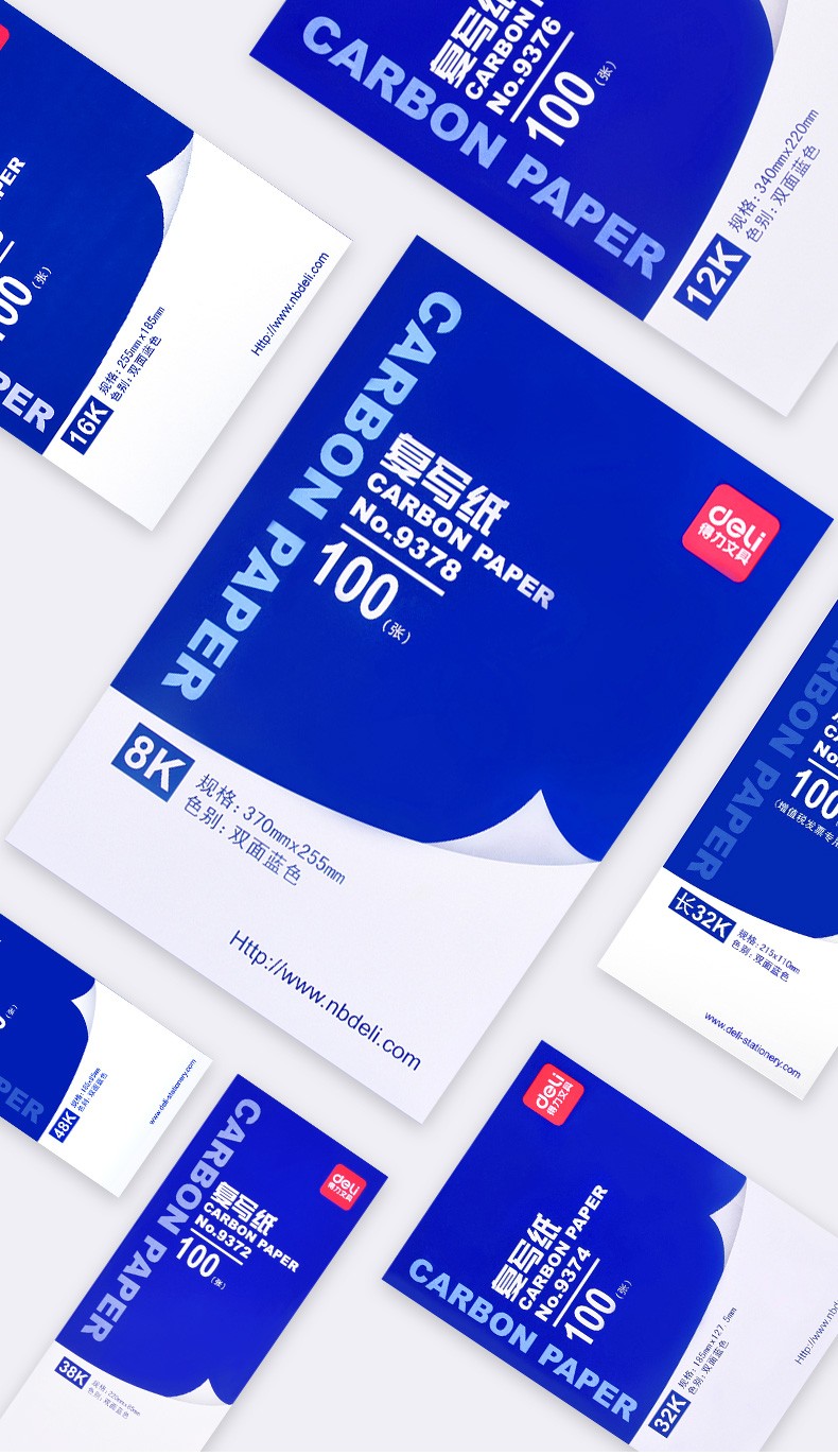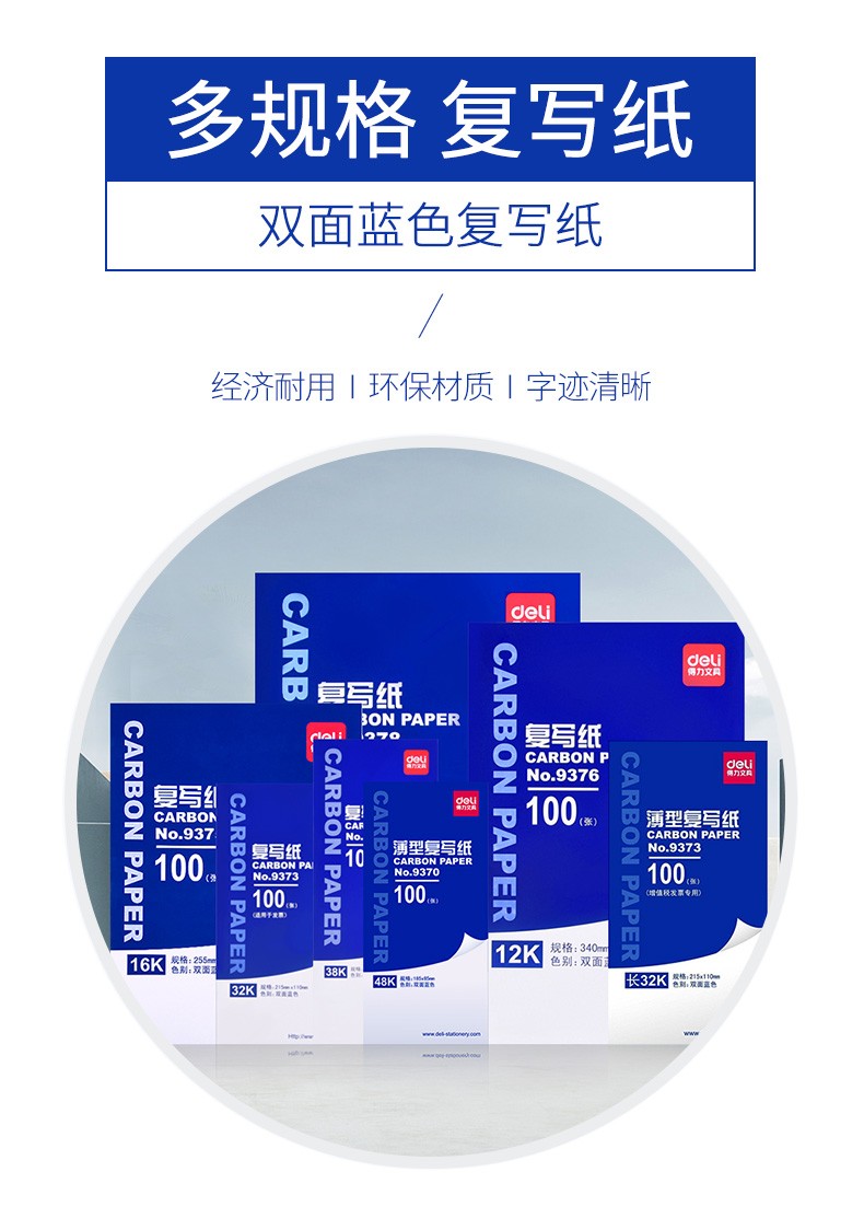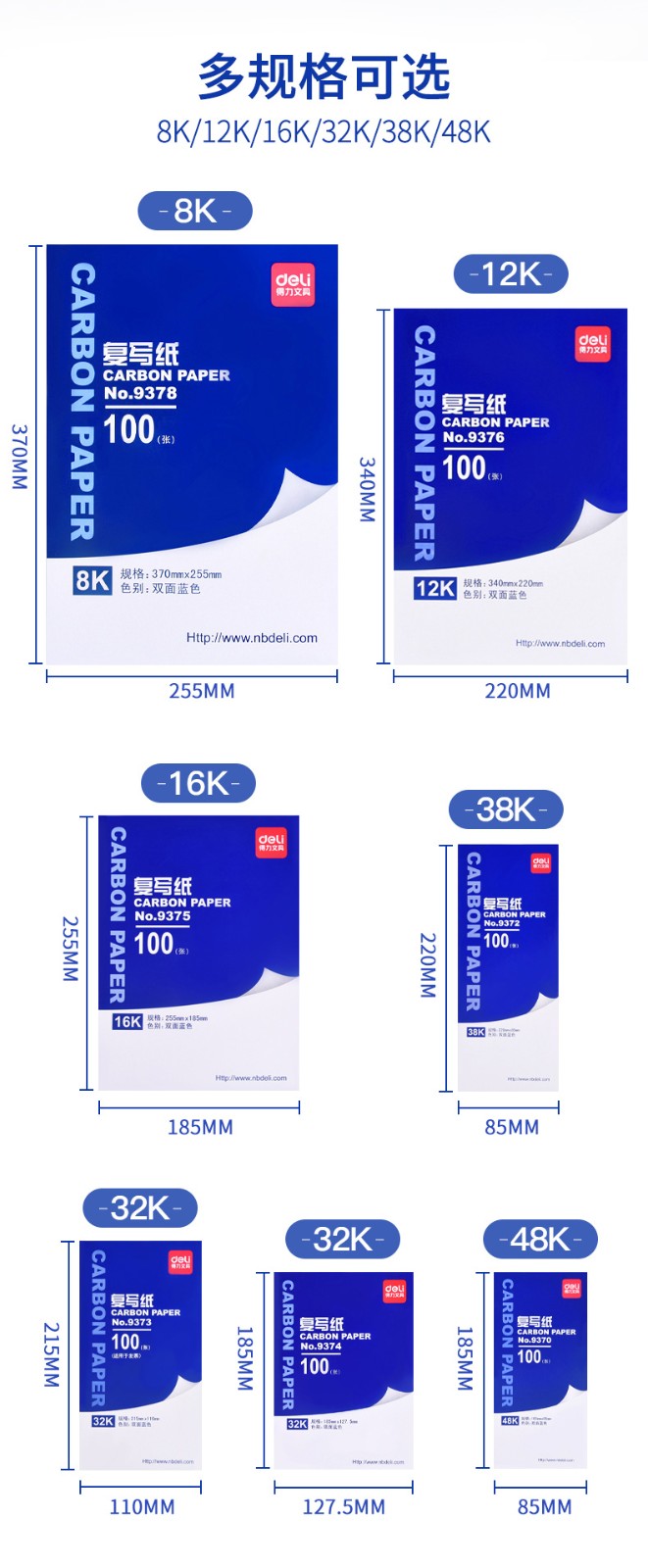 得力 复写纸,薄型双面蓝色印纸 办公用品 (9375)16K 255*185mm 单位:盒 |