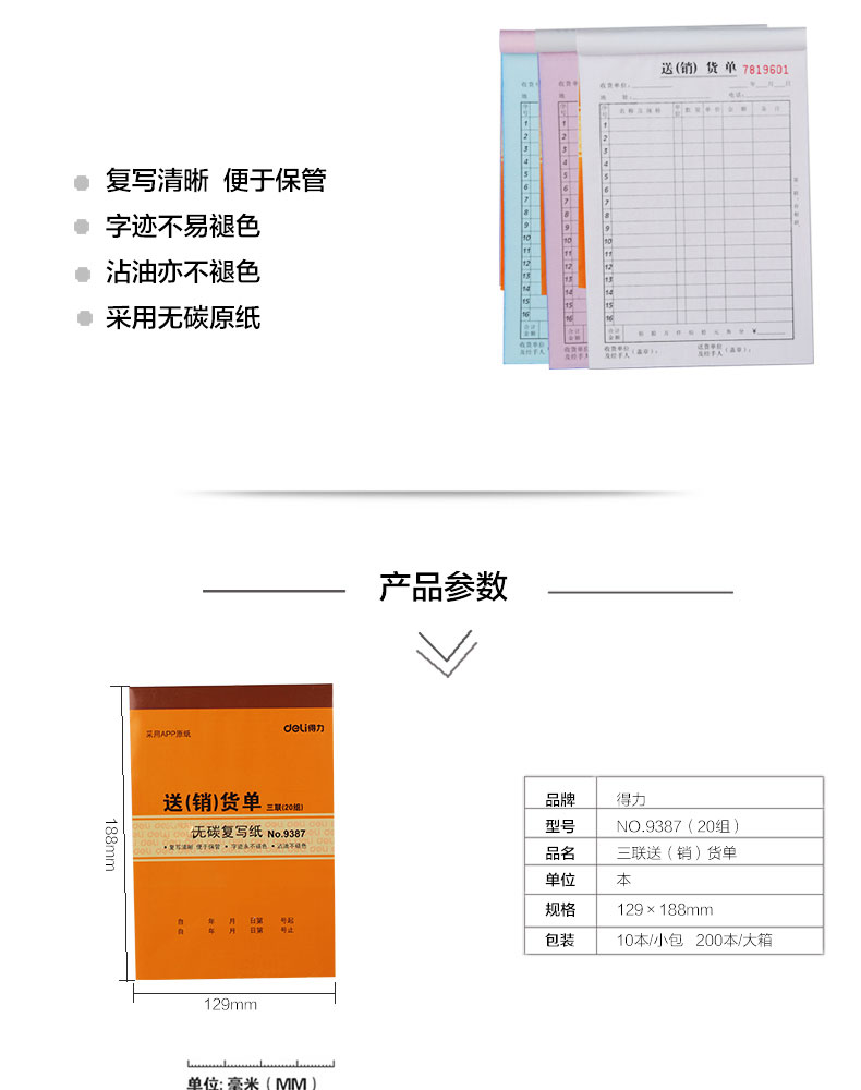得力(deli)三联多栏收据,无碳复写 175*87mm 10本装 9385 单位:包 |
